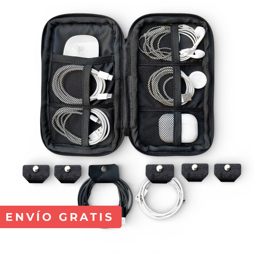 En este estuche puedes organizar tus cables: Cargador de celular, de tablet, de computador (no muy gueso) o audífonos. También puedes guardar tus accesorios tecnológicos como multipuertos, mouse, power bank, usb y demás.